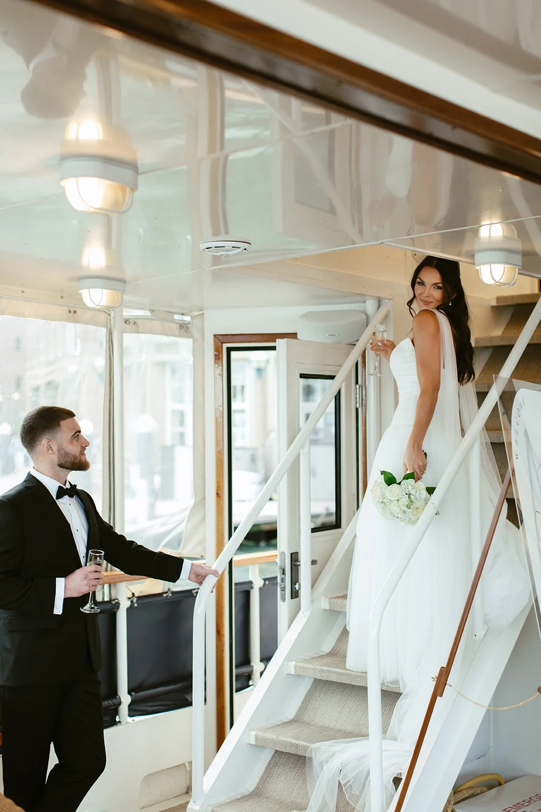 Eva’s focus on little details for her and Joe’s wedding day did not go unnoticed. From the save the dates, invitations, to her beautiful wedding dress accessorized with a neck scarf and timeless jewelry. The couple planned to do a first look, just the two of them, before heading onto the boat to see their family and friends. A quiet moment with just the two of them was the perfect way to kick off their celebrations along with a glass of champagne and some fun hotel portraits.